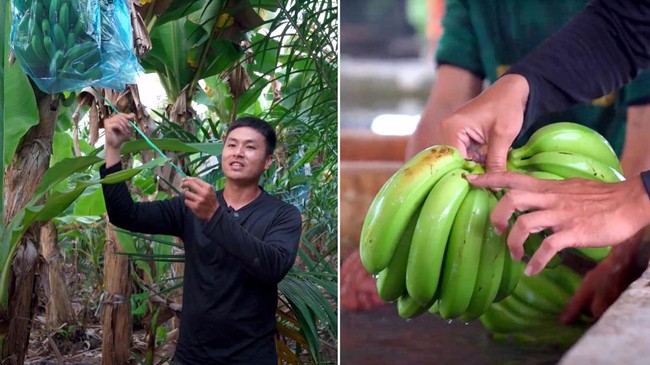 Dalam operasional pertaniannya, Huang membungkus sekumpulan pisang yang matang dengan kantong plastik biru. Dalam mengidentifikasi klaster pisang mana yang siap dipanen, ia menggunakan metode ini karena berbiaya rendah.