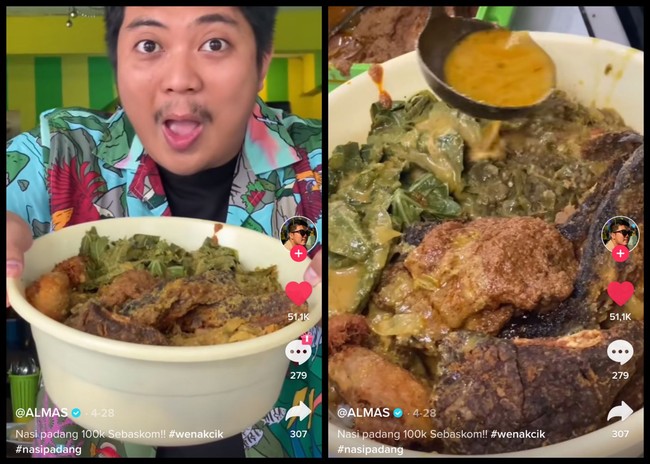 Pemilik akun media sosial The Fat Burger ini memesan nasi kandar hingga Rp 1,2 juta. Lauknya disiapkan di nampan besar dengan isian 33 ekor udang, 2 ekor cumi ukuran jumbo, telur cumi, olahan ayam, kepala ikan, hingga telur dengan bawang bombai.