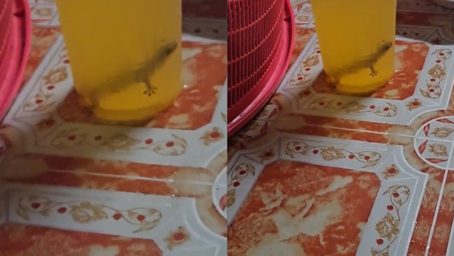 Pria ini dibuat trauma dengan es jeruk yang diminumnya. Setelah ia menemukan seekor cicak tengah berenang di dalam gelasnya.