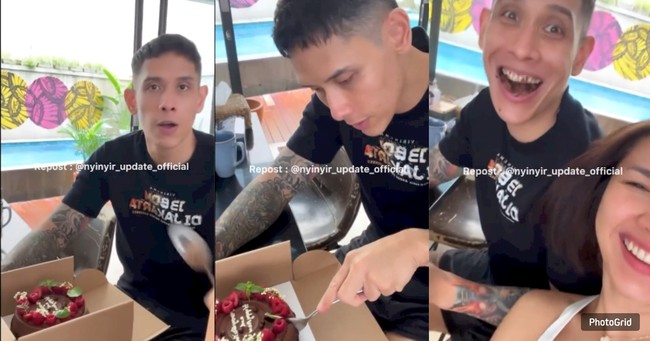 Andrea Dian yang memegang kamera ponselnya memperlihatkan Ganindra Bimo, suaminya, yang sedang membuka sekotak kue. Namun dalam ucapannya, Andrea menyebut bahwa kue itu dibeli oleh Bimo untuk dirinya sendiri.