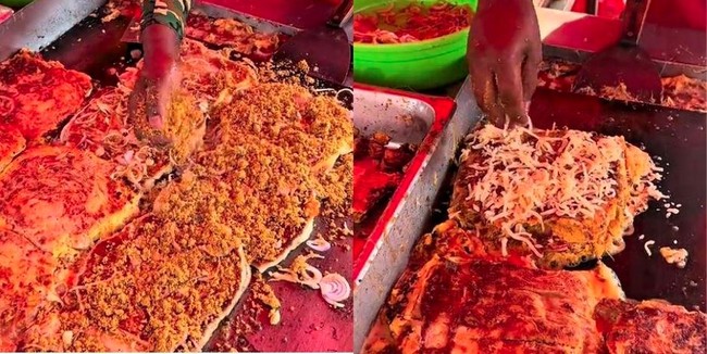 Dalam video yang berbeda luas di media sosial, penjual tersebut tengah sibuk membuat martabak pesanan pembeli. Ia memasukkan topping satu per satu hingga menggunung.