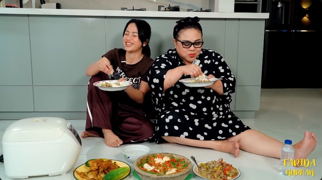 Mereka menikmati makanan yang telah disajikan oleh Farida NUrhan itu dengan lahap. Sesekali, Nunung juga menceritakan tentang kisah hidupnya.