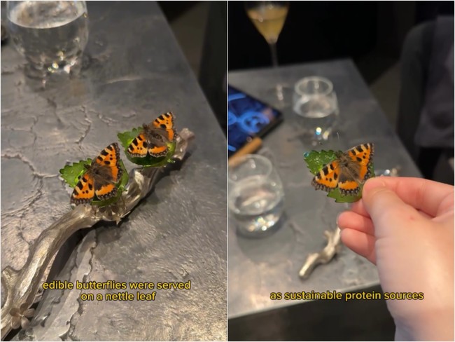 Pada sesi selanjutnya, ia juga disuguhi makanan berbentuk kupu-kupu. Tampilanya mirip seperti kupu-kupu asli, dari bentuk dan warnanya. Hadirnya menu satu ini untuk menyoroti tentang potensi penggunaan serangga sebagai sumber protein berkelanjutan.