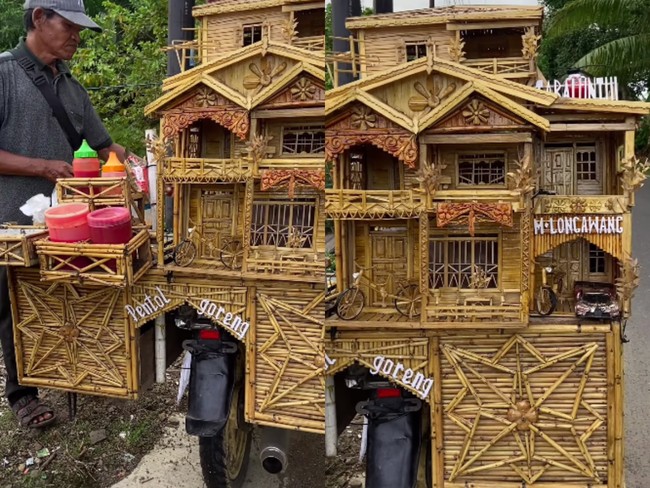 Gerobak motor penjual pentol goreng ini sukses menyita perhatian. Gerobaknya didesain dengan material bambu berbentuk rumah mewah yang artistik.