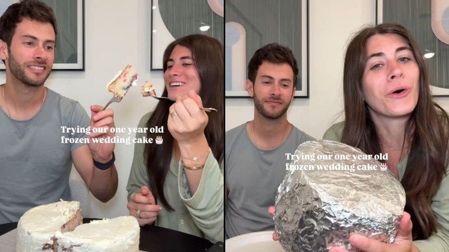 Pasangan ini memiliki cara unik merayakan hari jadi pernikahan mereka yang pertama. Mereka menikmati kembali kue pengantin yang dibekukan.