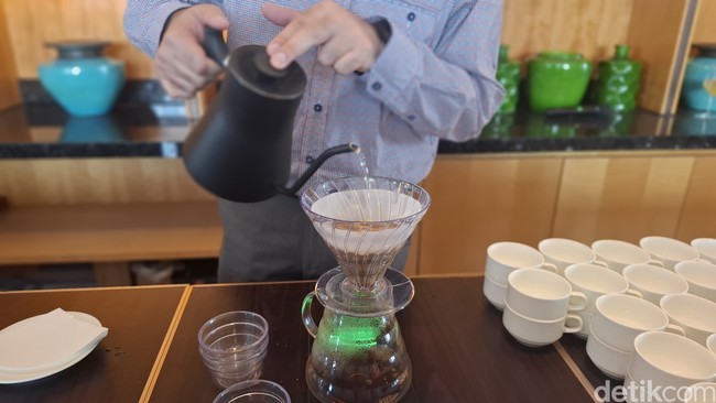 Proses penyeduhan untuk keempat biji kopi tersebut dilakukan dengan teknik pour over V60. Barista yang bertugas mengatakan kepada detikcom bahwa mereka menggunakan rasio 1:16 dengan dosis bubuk kopi 16 gram dan yield atau hasil seduhan kopinya sekitar 260 mililiter.