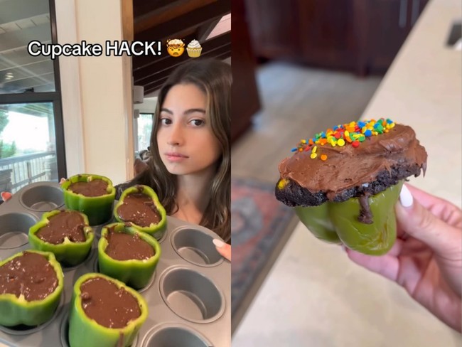 Wanita bernama Juliette memiliki cara unik saat membuat cupcake cokelat. Ia tak menggunakan loyang yang dilapisi kertas baking untuk memanggang cupcake, tapi justru malah paprika.