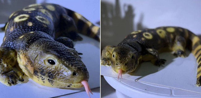Tampilan biawak air juga dihadirkan lewat warna kuning kehitaman, serta ciri khas buntut belang. Tak ketinggalan, lidah terbelah yang menjulur dari reptil ini.