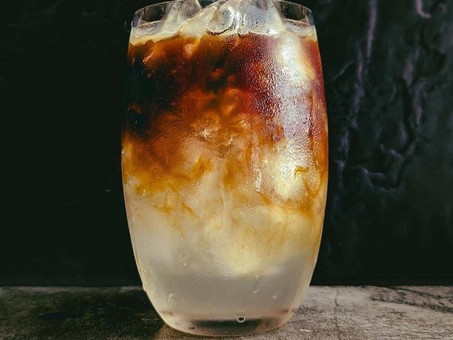 Racikan cloud coffee juga ada yang hanya menggunakan Americano. Jadi, segelas air kelapa disajikan dengan es batu, kemudian atasnya diberikan layer Americano yang pahit nikmat.
