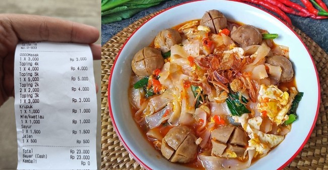 Pengunjung itu memesan seblak dengan isian jamur enoki (Rp 10.000), kerupuk (Rp 5.000), sayur (Rp 4.00), seafood (Rp 25.000), mie (Rp 6.000), bumbu seblak (Rp 4.000). Tapi yang membuat netizen terkejut adalah warung seblak ini mengenakan biaya untuk peralatan makan ke pengunjung.