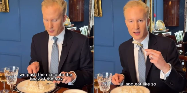 Pakar etiket asal Inggris, William Hanson, ramai disorot usai membagikan video cara makan nasi dengan garpu dan pisau di Instagram. Dalam video tersebut, ia menunjukkan teknik makan nasi ala etiket Inggris yaitu dengan cara mendorong nasi ke punggung garpu menggunakan pisau, layaknya makan kacang polong.