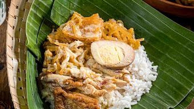 Di antaranya ada lauk ayam suwir, sayur labu siam, krecek, tahu, dan telur pindang. Nasi ayam ini juga disajikan dalam wadah daun pisang berbentuk pincuk. Untuk lauk pendampingnya, ada opor ayam hingga aneka sate.