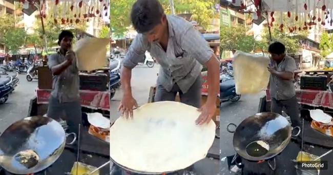 Penjual tersebut menawarkan roti paratha dengan ukuran besar. Dalam video 29 detik tersebut tampak atraksi sederhana dari penjualnya.