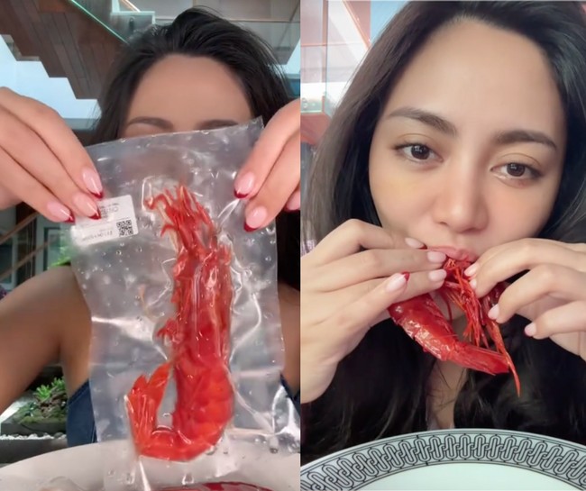 Rachel Vennya tampak bingung mengupas kulit udang viral ini. Sampai akhirnya dia berhasil dan memakan bagian dagingnya.
