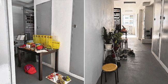 Sesajen itu diletakkan di meja di sepanjang lorong dan ada pula yang ditaruh tanpa alas di lantai lorong apartemen. Ritual itu dilakukan dengan membaca sutra atau teks suci dalam agama Buddha.