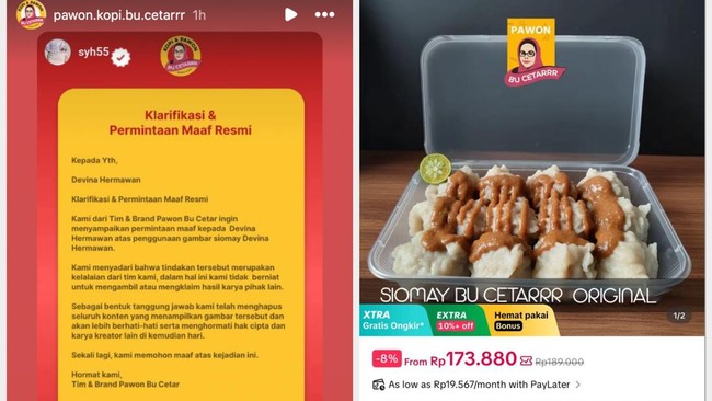 Media sosial dihebohkan dengan penggunaan foto siomay milik chef Devina Hermawan oleh adik Syahrini untuk keperluan jualan. Foto itu tercantum dalam deskripsi produk siomay milik Pawon Bu Cetarrr.