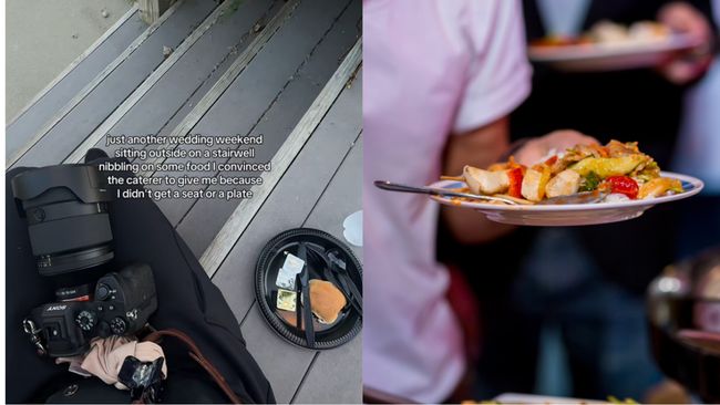 Dalam unggahan video TikTok @chelseamcfolling, fotografer ini curhat kalau ia harus makan di tangga luar tempat resepsi. Mengenaskannya lagi, Chelsea hanya bisa makan dengan sepiring kecil karena ia tidak punya makanan lain. Chelsea bahkan perlu meyakinkan pihak katering supaya mereka mau memberikan makanan tersebut kepadanya.