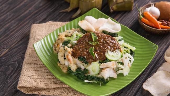 Dalam satu piring akan ditemukan beragam bahan matang seperti kangkung, toge, kentang rebus, tahu, tempe, dan telur yang sebelumnya telah direbus. Lontong atau nasi juga menambah elemen karbohidrat yang bikin kenyang.