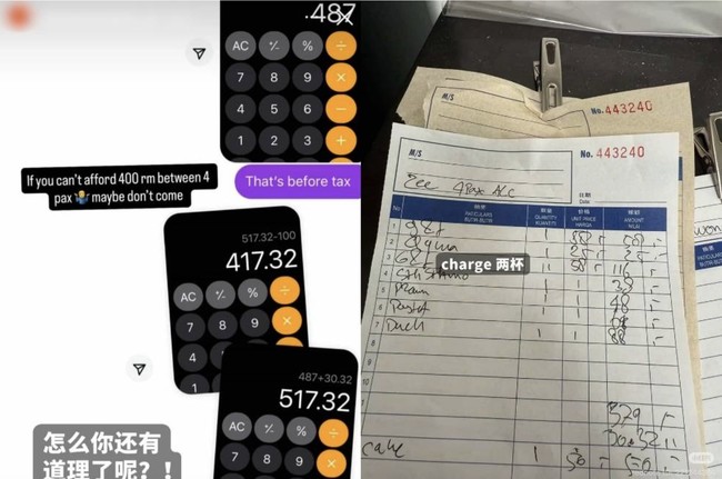 Restoran menjawab, "Hey jika kamu mau mempermasalahkan RM 58 (Rp 233.000), saya akan menyiapkan uang tunai untuk Anda yang siap diambil. Anda menghabiskan RM 500 untuk 4 orang. Tolong ambil uang tunainya besok dan jangan kembali."