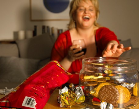 Salah satu cara efektifnya adalah dengan memangkas porsi camilan. Perkecil ukurannya dan makanlah pelan-pelan. Sebagai contoh, misalnya Anda nonton sambil makan popcorn. Jangan langsung ambil segenggam penuh, namun kurangi hingga setengah genggam saja.