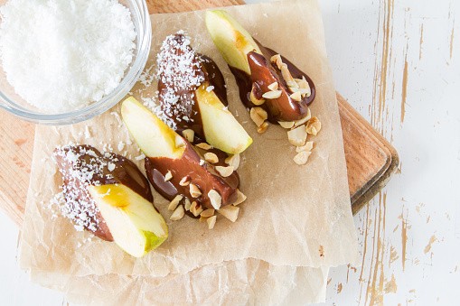 Cokelat, anggur, red wine, dan the, mengandung katekin flavonoid, yaitu antioksidan yang mengecilkan risiko aterosklerosis dan kanker. Ketika keduanya dipadukan, keduanya akan bekerjasama untuk meningkatkan kesehatan jantung. Tentunya, efek baik tersebut akan maksimal terjadi jika apel dan cokelat sama-sama organik dan segar.