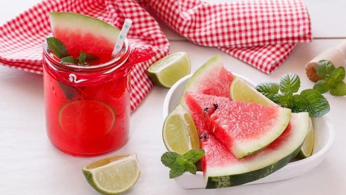 Buatlah jus semangka dengan tambahan 2 sdt jus lemon dan sedikit garam. Racikannya mampu memberi asupan mineral penting yang dibutuhkan tubuh di cuaca panas. Cocok sebagai minuman energi terbaik menumpas dehidrasi.