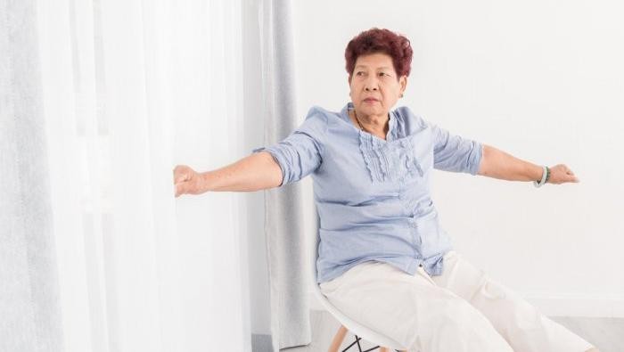 7. Renggangkan bahu dalam posisi duduk