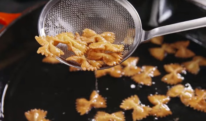 Sedang tak ada camilan? Manfaatkan saja pasta ukuran kecil seperti bowtie pasta, makaroni atau fusilli. Goreng sampai renyah lalu tambahkan bumbu favorit seperti bubuk dengan citarasa tertentu. Delish (28/2) juga punya olahan keripik pasta yang enak dengan rasa khas Italia.