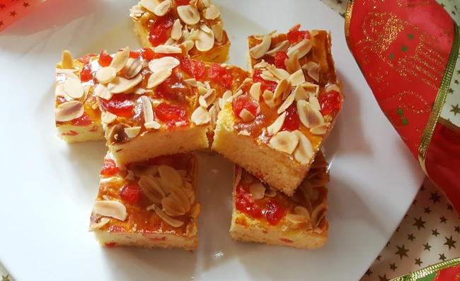 Cake margarin bertabur ceri dan almond ini sederhana tetapi rasanya legit lembut. Gampang dibuat dan bisa jadi suguhan tamu atau bingkisan hari raya natal.