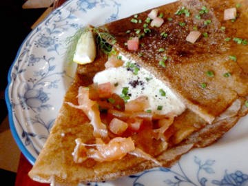 Untuk crepes gurih yang setara dengan sandwich, harganya rata-rata Rp 65 ribu. Favorit saya adalah L'Alaska, yaitu crepe dengan ikan salem asap (smoked salmon), krim kocok, ditaburi sedikit caviar. Mak nyuss!