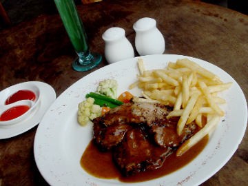 Seperti umumnya porsi lamb chop, yang datang memang tiga iris cukup tebal daging domba dengan tulang di salah satu, disiram saus demi glace setengah kental, kentang goreng, kembang kol, wortel, dan buncis. Porsinya menarik. Tingkat kematangan lamb chop-nya sempurna. Sausnya gurih dan terasa sekali intensitas kaldunya. Mak nyuss!