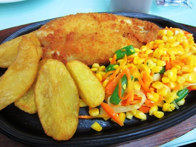Tampilan steak dori cukup menggugah selera. Fillet ikan dori berukuran lumayan besar digoreng tepung dan disajikan bersama sayuran serta kentang goreng.