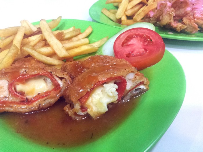 Keju pun terasa sangat dominan. Meskipun fillet ayamnya terasa juicy. Tambahan kentang goreng membuat Chicken Salami ini mengeyangkan. Boleh dibilang ini versi populer Chicken Cordon Bleu yang banyak jadi sajian restoran bermenu Barat.