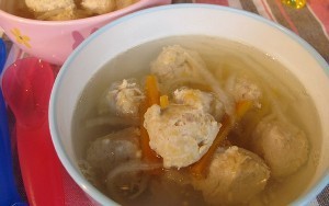 Bakso yang kenyal dengan rasa ayam selalu menarik perhatian si kecil. Diberi campuran sawi putih dan wortel yang diiris halus dengan kuah kaldu membuat sup ini terasa gurih. Sup ini juga dapat dipadukan dengan nasi tim, ketupat atau nasi hangat. Klik disini untuk lihat resepnya.