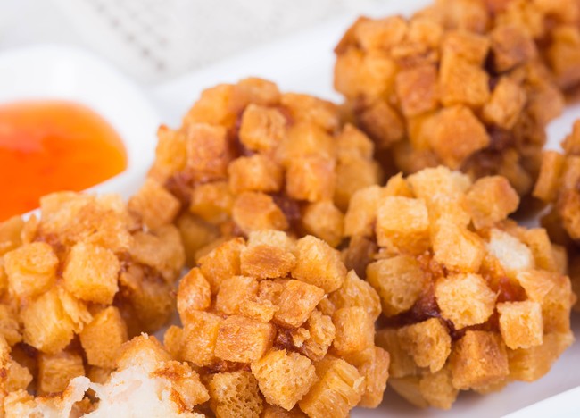Bola udang ini jadi menu dimsum favorit karena rasa gurih renyahnya. Adonan udangnya kenyal gurih dengan balutan potongan kecil roti tawar yang garing renyah.