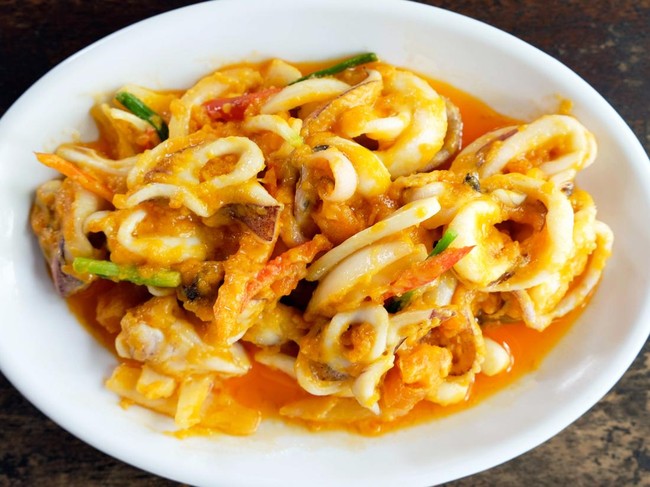 Saus telur asin tak hanya enak dipadukan dengan udang dan ayam tetapi juga dengan cumi-cumi. Cumi yang kenyal semakin enak dibalut saus telur asin yang gurih.