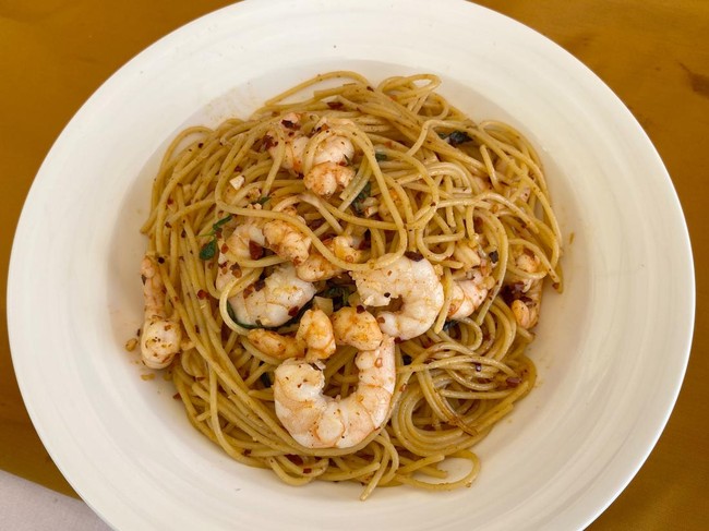 Meskipun bumbunya sederhana, spaghetti ini rasanya gurih mantap. Udang segar dan cabe kering membuat rasanya gurih sedikit pedas dan mantap.