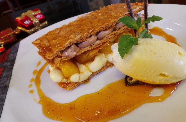 Jakarta - Dessert Prancis dengan lapisan pastry dan dua jenis krim yang lembut legit ini punya paduan tekstur yang unik. Irisan apel memberi rasa asam segar yang enak. Makin lengkap dinikmati dengan es krim vanili.