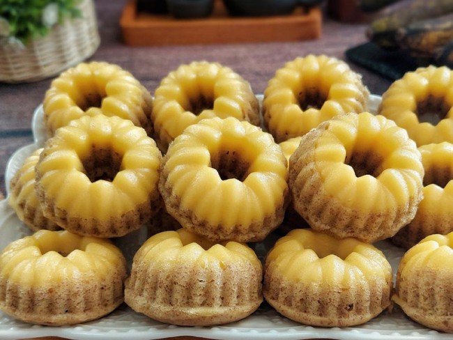 Kue putu ayu yang satu ini tidak memakai pandan dan kelapa melainkan pisang dan keju. Rasanya ringan, empuk, legit sekaligus gurih. Enak buat teman ngopi.