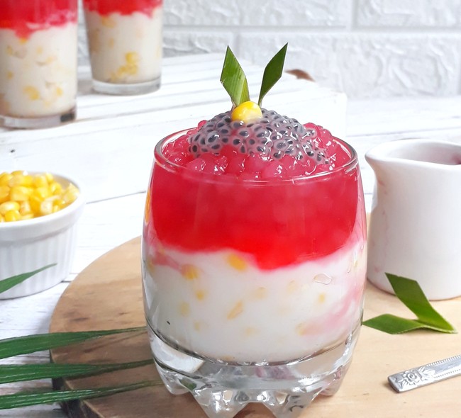 Kudapan manis dan dingin ini enak dinikmati saat kumpul keluarga. Paduan bubur sumsum jagung dan sirup cocopandan yang wangi legit. Mantap rasanya!