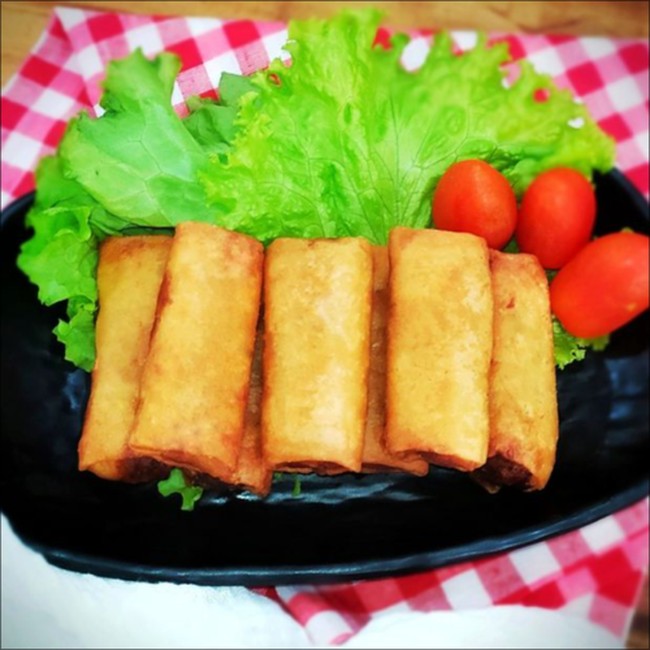 | 3. | Goreng lumpia di dalam minyak panas, sampai berwarna kuning keemasan. Tata di piring saji dan beri selada dan tomat cherry. |