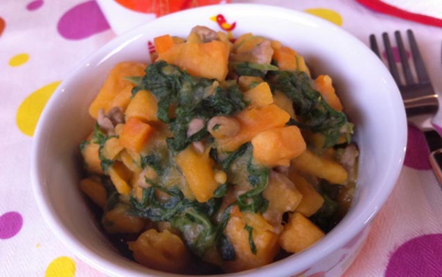 Ubi yang kaya betakaroten dengan tekstur lembut dan manis rasanya ini bisa jadi sumber karbohidrat. Tambahan bayam dan daging cincang melengkapi nutrisi makanan ini. Sajikan hangat agar si kecil makin lahap.