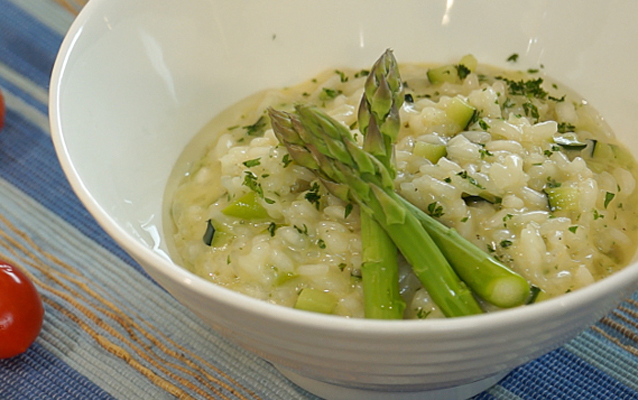 Risotto, sajian nasi khas Italia ini banyak versinya. Ada yang dicampur seafood, ayam atau keju. Yang satu ini diberi paduan asparagus dan zucchini. Rasanya renyah dan gurih karena tambahan keju parmesan. Enak dimakan hangat!
