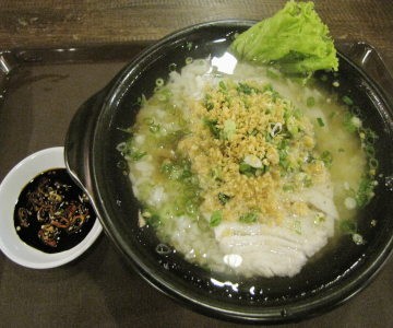 Informasi itu saya buktikan setelah semangkuk Bubur Ikan Singapura tersaji di depan saya. Di dalam mangkuk berukuran sedang tampak irisa tipis lebar daging ikan kakap (fillet kakap). Kuahnya bening dengan cincangan bawang putih goreng dan daun bawang merah. Wah, aroma gurihnya benar-benar menggelitik hidung!