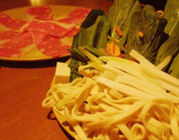buah piring besar disajikan berupa irisan tipis daging sirloin dan satu lagi sayur-sayuran seperti tauge, sawi putih, daun seruni, bokchoy, irisan wortel, udon, dan tahu.Β Setelah diisi dengan air kaldu rebusan ritual mencelupkan daging beserta sayur-sayuran ke dalam panci pun mulai saya lakukan. Woww... irisan dagingnya empuk dengan balutan tipis lemak.