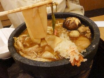 Berbeda dengan ramen, kishimen disajikan dalam mangkuk batu yang panas mengepul. Kuahnya benar-benar masih bergolak mendidih. Isinya lumayan komplet mulai dari irisan sawi putih, jamur enoki, irisan kamaboko, dan sepotong tempura goreng diatasnya plus telur ayam yang masih mentah. Kuahnya berwarna kecoklatan keruh, sedikit kental dengan rasa gurih enak yang berasal dari miso dan telur yang sudah mengental matang. Menurut saya sih mi kishimen ini mirip dengan kwetiaw, namun minya berukuran lebih lebar dengan tekstur yang lembut kenyal.