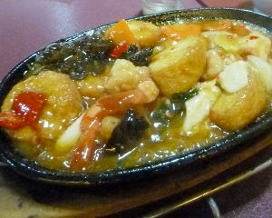 Kontras dengan rasa daging yang kenyal-kenyal lembut, Tahu Hotplate Saos Sichuan memakai tahu sutera Jepang yang super lembut. Tahu ini diiris-iris tak terlalu tipis dengan campuran udang, jamur kuping, wortel, bawang bombay dan daun bawang plus saus Szechuan yang manis-manis pedas. Karena memakai hot plate maka hidangan ini tetap hangat hingga suapan terakhir.