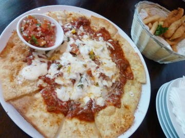Yang dimaksud Nachos Pizza Ala Cage sebenarnya adalah makanan khas Mexico yang terbuat dari keripik jangung alias nachos yang renyah. Seporsi berisi 12 buah nachos yang dilengkapi dengan semangkok kecil tomato salsa. Bedanya yang satu ini dibuat berbentuk bundar mirip seperti pizza dengan topping saus tomat segar. Wah, irisan daging cincang dan keju mozarella diatasnya cukup royal.