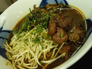 Lain halnya dengan mi kuah yang disajikan dalam mangkuk besar dan lebar. O la la...tampilannya sungguh menggiurkan. Irisan daging sapi yang kecokelatan menutupi setengah bagian permukaannya, dilengkapi dengan tauge besar (moyashi) yang royal dan tampak crunchy. Kuahnya bening kecokelatan menggenangi tumpukan mi yang halus.