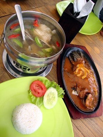 Saat menyambangi rumah makan Radja Gurame tentu saja kami ingin menikmati ikan gurami yang enak. Maka dua menu gurami unggulan mereka yakni Gurame Hotplate BBQ (Rp 35.000) dan Sup Gurame (Rp 35.000) langsung kami pesan. Keduanya disajikan dalam paket bersama nasi putih serta lalap selada, mentimun, dan tomat.